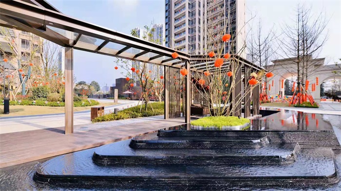 接纳精练的几何线条,突出纯粹性;色彩亮丽、雅致。园林景观包括雕塑小品、廊亭、软景等,以“公园”的设计理念打造成都·温江公园大宅,为业主创立恬静的康健生涯。