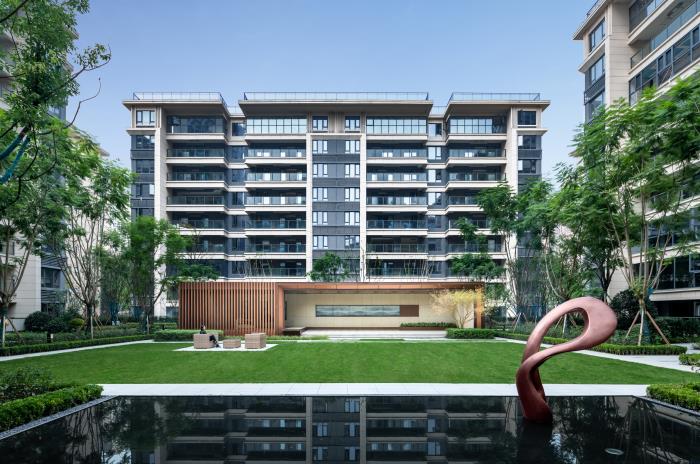 项目位于成都会温江区。通过几何式的直线条组成秀气精练的修建外观,设计上凸显高雅隽永、愉悦奢华的艺术感,条理富厚,适用大气。