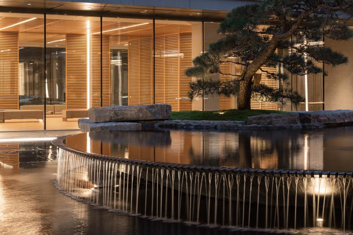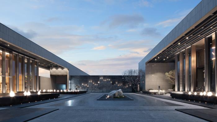 该项目气概为现代自然风搭配怡淡田园气概。现代主义的硬景塑造形式与景观的自然化处置惩罚相团结,主要元素为广场、结构物、草地、喷水池、林荫道、庭院等。结构主轴为中心线,双方对称庭院;乔木多为阵列栽植,灌木呈几何形式,形成绿墙、绿障、绿篱笆;庭院以静水为主要水面景观,遮掩喷泉,以清静坦荡见长,其他水景有喷泉、跌水。各交织点也安排小喷泉池,作为装饰和指导。地面多接纳自然石材饰面,铺地支解线显着,蹊径两旁遮掩雕塑和瓶体,显得高雅素净。